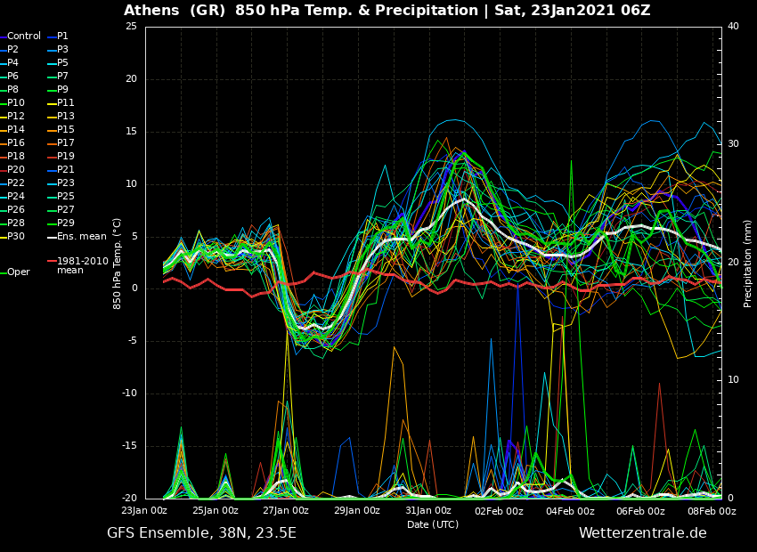 καθε χρονο δυο-τρεις ψυχρες εισβολες τις κανει...αυτη που ερχεται τριτη τεταρτη αν και εκφυλισμενη , λογιζεται ως τετοια...αρα πιθανοτατα να τελειωνουμε καπου εδω..ensembles αθηνων-παρισιου-βαρκελωνης-λονδινου..με τετοια εικονα καιγεται ευκολα το πρωτο δεκαημερο του φλεβαρη..τα μεσοπροθεσμα μας βαζουν με θετικη αποκλιση και παλι για τον φλεβαρη..τι πρωτοτυπο....αν ομως το πρωτο δεκαημερο βγει πολυ πανω απο τα κλιματικα , αυτο το +1 +2 που βλεπω μονο με ενα τροπο θα μαζευτει ..ειτε με μια δυνατη ψυχρη εισβολη ειτε με χειμωνιατικες φυσιολογικες συνθηκες για τον υπολοιπο μηνα...υπομονη αλλα τα νεα δεν ειναι ενθαρρυντικα....